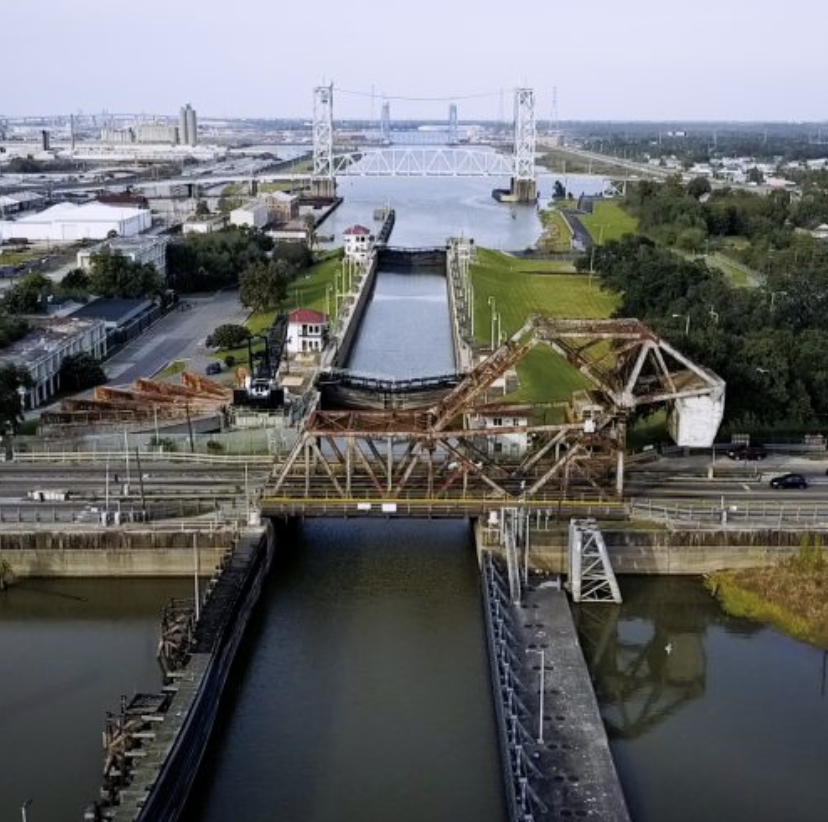People call a lot of places around here the “end of the world.” First time I heard the term it was on a Grand Isle beach with some friends after the 2010 BP oil spill. The name made sense, especially with our feet sinking in the warm wet sand as we counted drilling platforms in the distance, just down the way from where environmental clean-up crews dealt with the brown tar washed ashore. The moniker came up again for Cocodrie, a dot on the map at the gulf front end of Highway 56, and again for Shell Beach on Lake Bourne and Delacroix Island deep in Saint Bernard Parish. The nickname seems fitting for these places, as to go any further you’d need a boat. Beyond, no infrastructure, no people. Just marsh grass, water, and sky as far as the eye can see. Now, standing on the Industrial Canal levee behind the abandoned Naval Support Activity Base Buildings, I’m confused. Some people call this strip of land the “end of the world” too, but looking out across to the Lower Ninth Ward where I can clearly see (and could converse with if not for the loud hum of a barge floating nearby) a man pushing a cart full of building supplies.